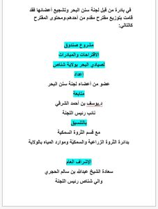 إيمانا من الجميع بأهمية العمل الجماعي الجاد وانطلاقا بتفعيل مهام لجنة سنن البحر بالولاية .وتأسيساً على ما سبق ذكره فقد ارتأيت المشاركة في إعداد صندوق للاقتراحات والمبادرات والصعوبات التي تواجه صيادي البحر بالولاية بالتنسيق مع قسم الثروة السمكية ؛ليكون ضمن الأعمال المنجزة لهذه اللجنة والتي برئاسة سعادة الشيخ والي شناص رئيس اللجنة.