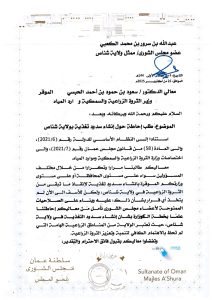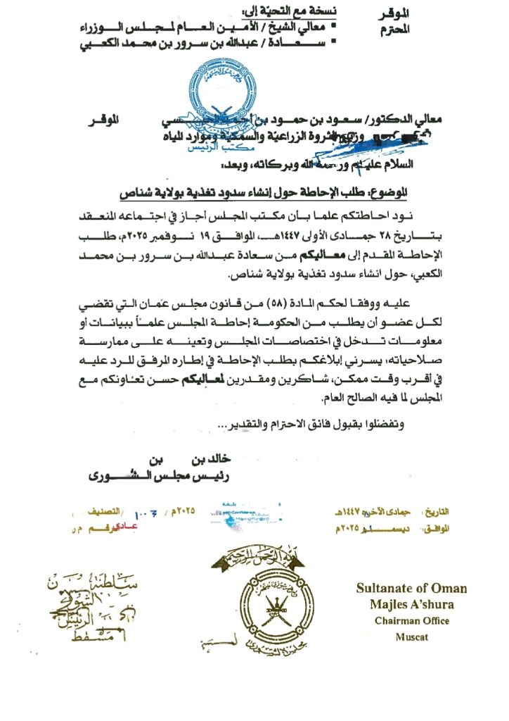 🔵 استنادا للمادة (58) من قانون مجلس عمان (رقم7 /2021) عضو مجلس الشورى يواصل تفعيل الصلاحيات المتاحة للمطالبة بإنشاء السدود لإنقاذ الزراعة في شناص
