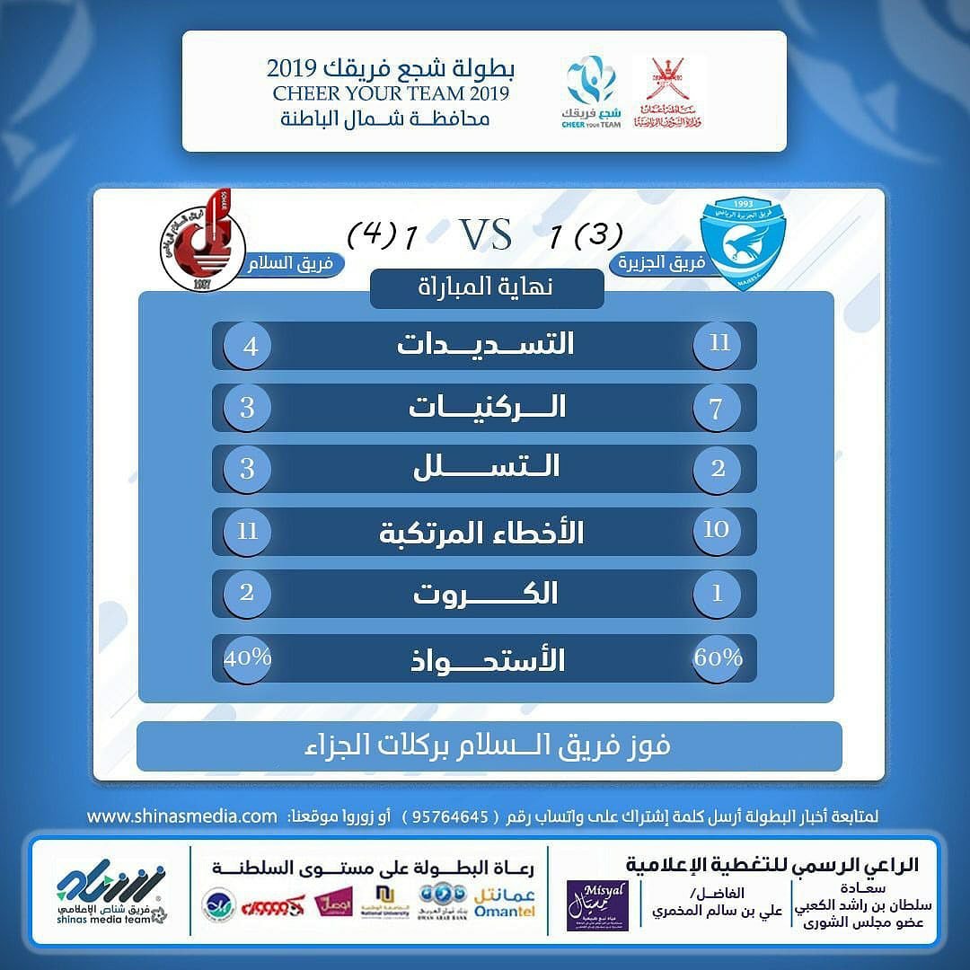 إحصائيات مباراة الجزيرة والسلام في بطولة شجع فريقك ٢٠١٩م على مستوى شمال الباطنة #تصوير_بدر_المزروعي  #شناص_ميديا   #تصوير_ناصر_العماني #شجع_فريقك2019 #كورة #رياضة #إبداع #إعلام #سلطنة_عمان #شناص #لوى #ابداعات_شبابية ‎@cheeryourteam ‎@KooooraWaBas ‎@al_wisal ‎@Omantel ‎@oman_league
