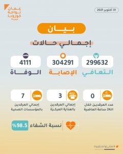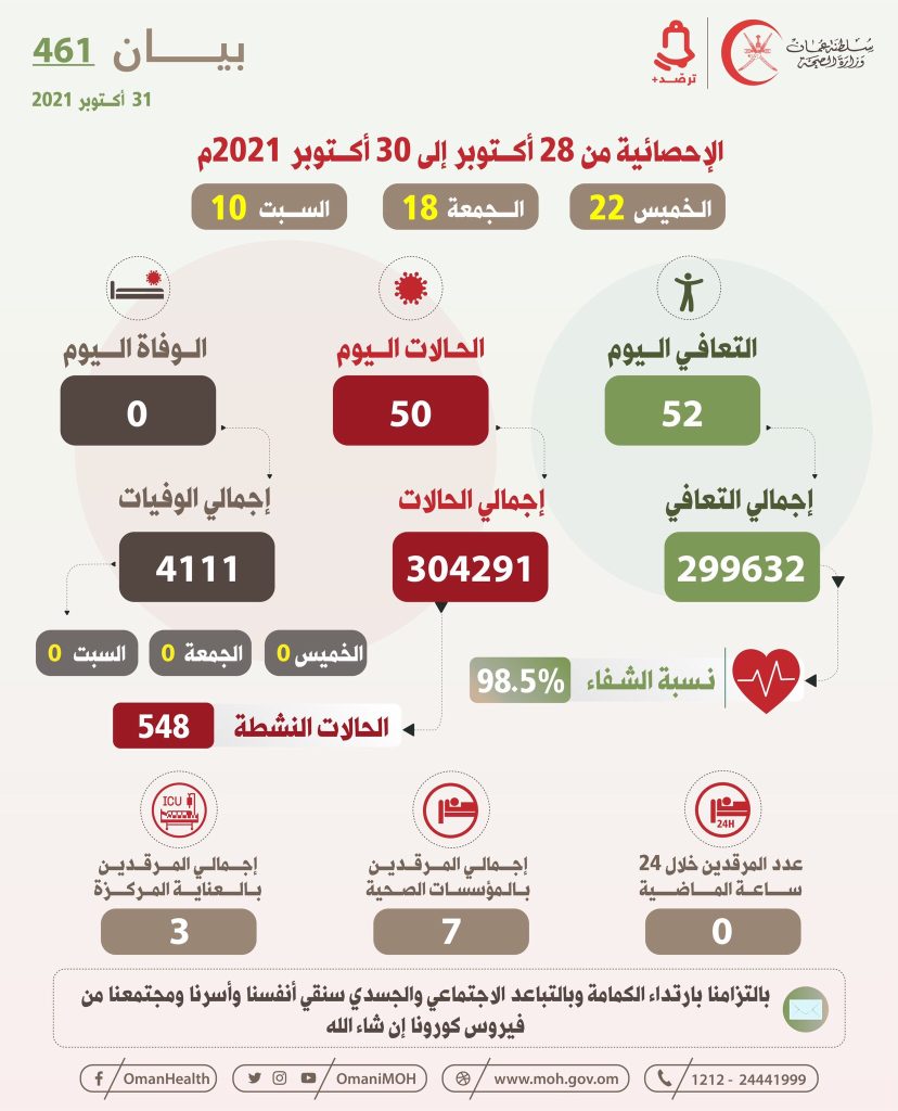 إحصائيات وزارة الصحة خلال الثلاث الأيام الماضية من تاريخ 28 أكتوبر إلى 30 أكتوبربواسطة Ali alkhawar / 31 أكتوبر، 2021 تسجيل 50 إصابة جديدة بفيروس #كورونا ، و لا وفيات خلال 3 أيام الماضية (الخميس، الجمعة، السبت).