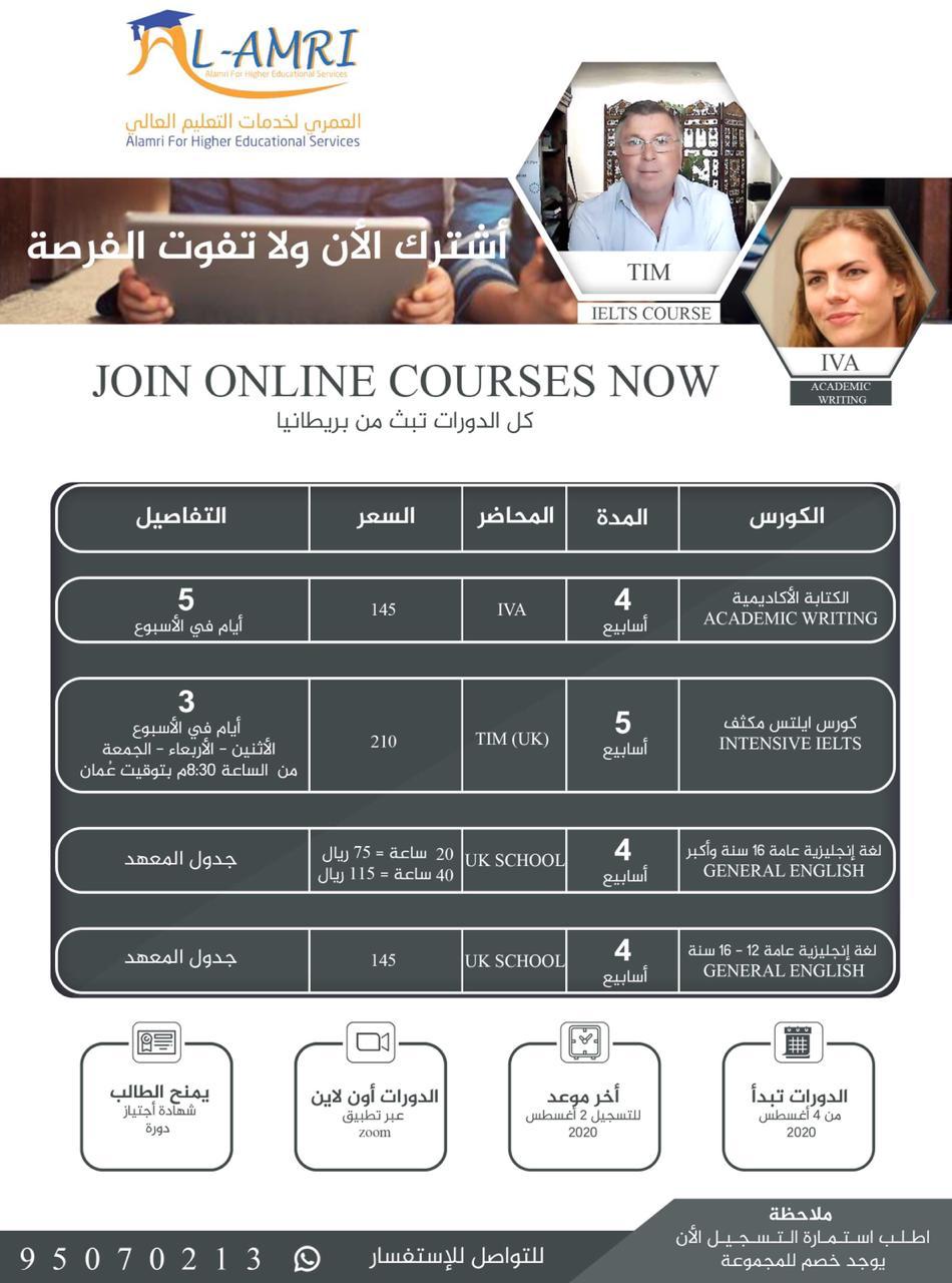 #online_courses from UK 🇬🇧 Join NOW برامج و دورات لغة إنجليزية تخصصية للأعمار ١٢ سنة فما فوق بإمكانكم مراسلتنا على الواتساب ‏http://wa.me/96895070213 للتسجيل : 95070213 99874456 العمري لخدمات التعليم العالي تصريح رقم : د.م.خ. ١٠٥ / ٢٠٢٠