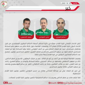 أعلن الأتحاد العماني لكرة القدم ، ممثلا في دائرة الحكام إنضمام ابن ولاية شناص الحكم يحيى بن أحمد البلوشي حكما دولي للساحة وتتقدم الأسرة الرياضية لفريق شناص الإعلامي بالتهنئة له متمنين له دوام التوفيق والنجاح.