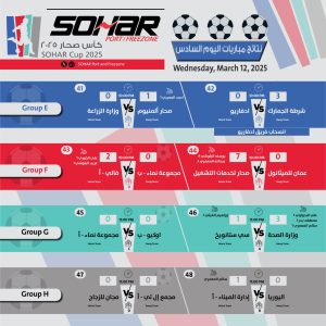 شهدت الجولة الثالثة من بطولة كأس ميناء صحار والمنطقة الحرة 2025، التي أقيمت ليلة الأربعاء 12 مارس 2025 اكتمال الفرق المتأهلة لدور 16 التي ستنطلق يوم الأحد القادم حيث تأهلت فرق (الجمارك -صحار للألمنيوم -صحار لخدمات التشغيل -فالي (أ) –وزارة الصحة –اوكيو (ب) –زجاج مجان –ادارة الميناء (أ) )