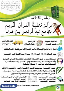 بمناسبة قدوم شهر الرحمة والغفران شهر القرآن ، يعلن مركز جامع عبدالرحمن بن عوف عن البدء بالتسجيل في دورة تحفيظ القرآن الكريم لهذا العام والمقتصرة فقط على أبناء المنطقة للمرحلة: من الصف الأول إلى الصف التاسع فقط ، وذلك ابتداء من يوم الأحد القادم إلى تاريخ 28 من شهر شعبان .