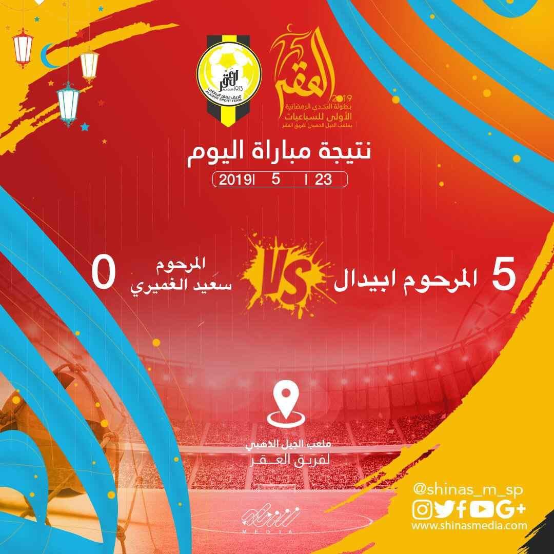 بطولة التحدي الرمضانية الأولى للسباعيات بملعب الجيل الذهبي لفريق #العقر بولاية #شناصبواسطة Ali alkhawar / 24 مايو، 2019 نتيجة مبارة دور 4 والتي جمعت فريق المرحوم ابيدال وفريق المرحوم سعيد الغميري