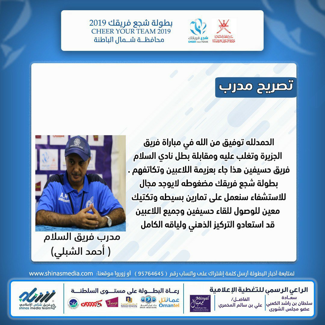تصريح مدرب فريق السلام في بطولة شجع فريقك ٢٠١٩م على مستوى شمال الباطنةبواسطة Ali alkhawar / 19 يوليو، 2019