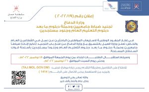 تعلن وزارة العمل بالتنسيق مع وزارة الدفاع عـن فتح باب التجنيد (ذكور/إناث) ضباطاً جامعيين وحملة دبلوم ما بعد دبلوم التعليم العام وجنودا مستجدين بأسلحة قوات السلطان المسلحة.ابتداء من يوم غد 2022/11/18 وحتى 2022/11/26.