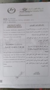 تنبيه: سوف يتم قطع التيار الكهربائي غدا عن منطقة سور البلوش ما بين: