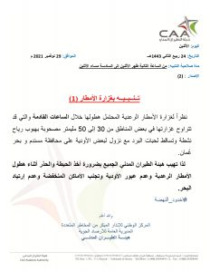 في بيان لهيئة الطيران المدني على حسابها على تويتر حذرت من غزارة الأمطار الرعدية المحتمل هطولها خلال الساعات القادمة، والتي تترواح غزارتها من (30 – 50 ملم)، وما يصاحبها من هبوب للرياح النشطة، وتساقط لحبات البرد مع نزول بعض الأودية على محافظة مسندم وبحر عمان، أثر أخدود النهضة.