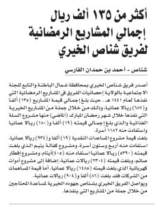 ‏جريدة عمان :أكثر من 135 ألف ريال إجمالي المشاريع الرمضانية لفريق شناص الخيري كتب/أحمد بن حمدان الفارسي