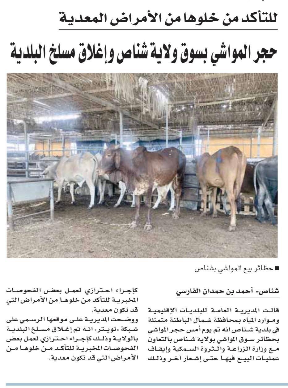 جريدة عمان : للتأكد من خلوها من الأمراض المعدية : حجر المواشي بسوق ولاية شناص و إغلاق مسلخ البلديةبواسطة المهندس علي الريسي / 7 سبتمبر، 2019