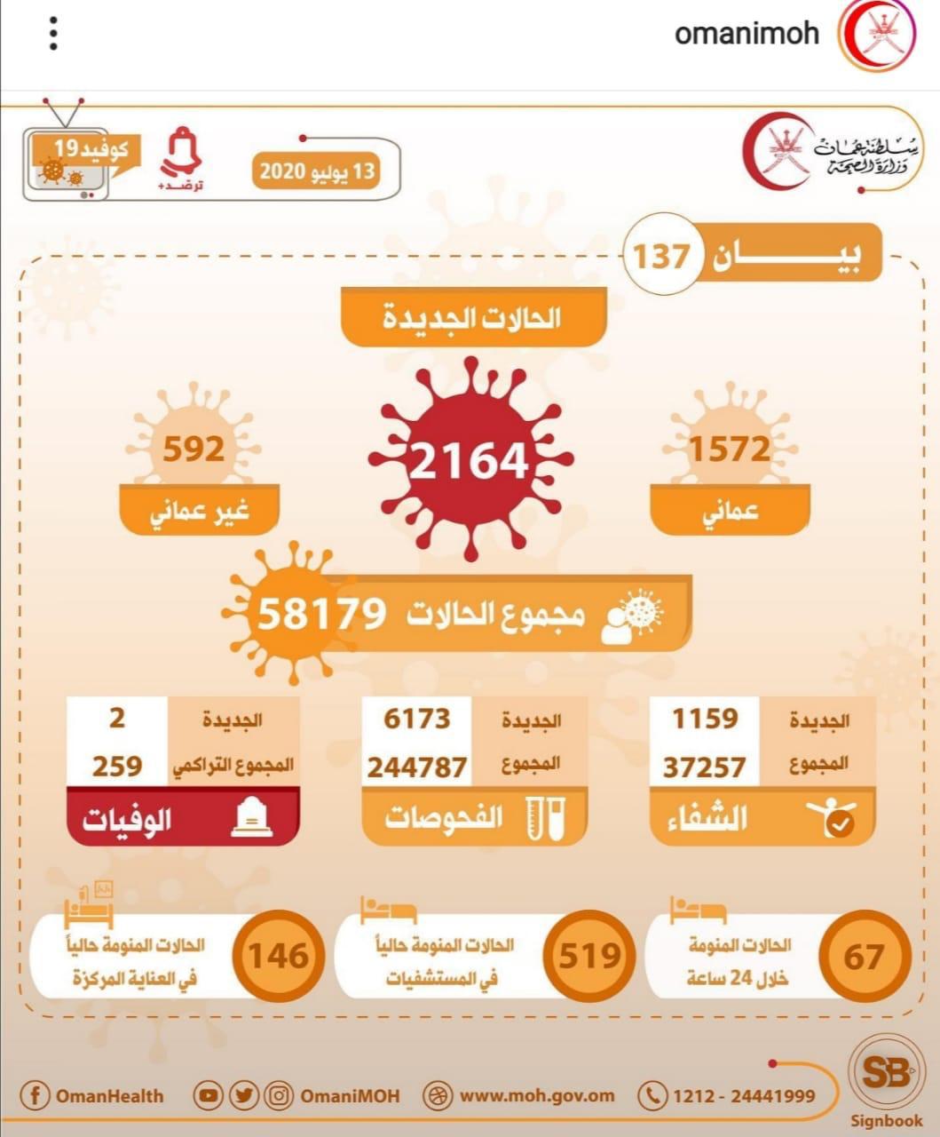 حالات الإصابات الجديدة بفيروس كورونا المستجد بولاية شناص