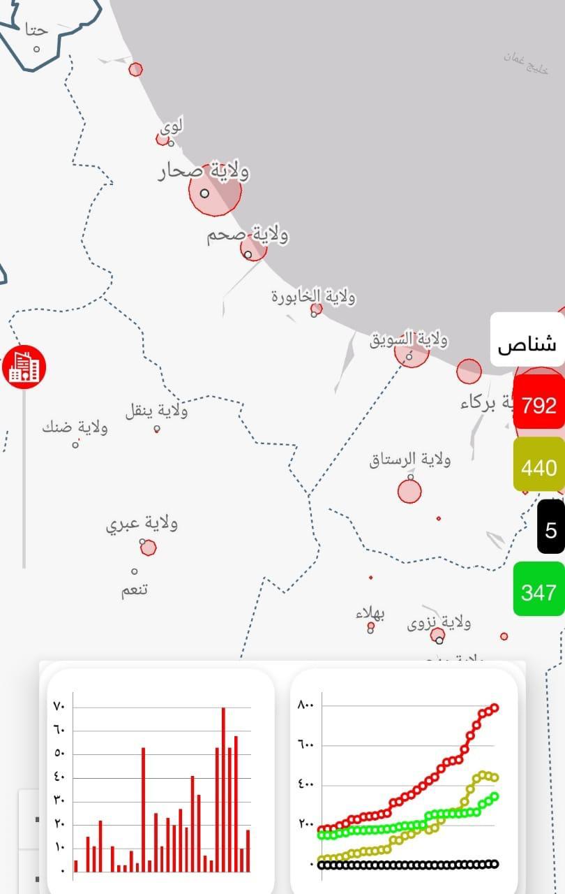 حالات الإصابات الجديدة بفيروس كورونا المستجد بولاية شناصبواسطة Aisha Al-Zaabi / 17 يوليو، 2020 *ولاية شناص:*مجموع الحالات792المتعافون347المرضى440الوفيات5الإصابات الجديدة18المتبقي 440مجموع حالات الشفاءلليوم25