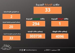 حالات الإصابات الجديدةبواسطة Ali alkhawar / 29 سبتمبر، 2021 تسجيل حالة وفاة بفيروس كورونا و/33/ إصابة وتعافي /294/ حالة ونسبة التعافي ترتفع إلى 98 بالمائة.