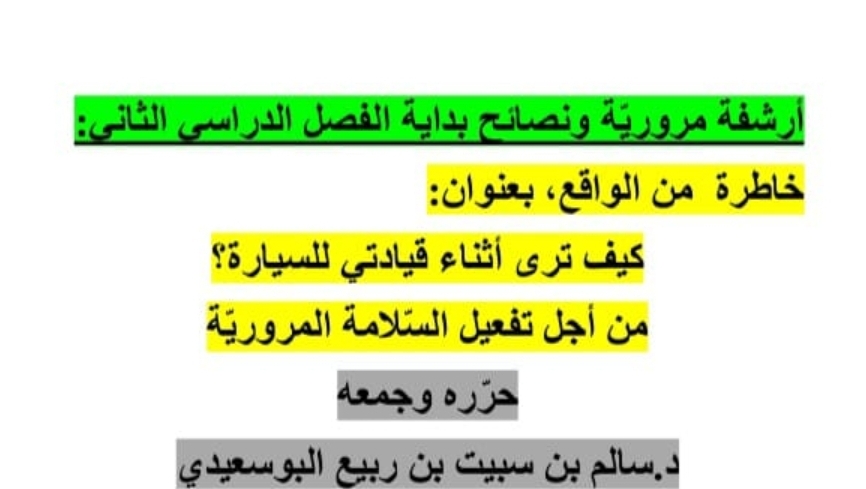 قبل كل شيء لابد أن أعرّفكم أيّها القرّاء الأماجد بأنّ هذه الخاطرة بنصائحها المروريّة وعنوانها وتفعيل السّلامة المروريّة من كتيّب تمّت موافقته من قبل وزارة الإعلام العُمانيّة. وهو عبارة: مقالات وخواطر نًشرت في عدة منتديات ومواقع وخاصّة موقع الإدارة العامة للمرور بشرطة عمان السلطانية خلال السنوات الماضية، وأحببت المشاركة مع بداية الفصل الدراسي لجميع الفئات القياديّة للحافلة أو السيارة‘ فإليكم خاطرتي معترفًا بالتقصير، فأقول: هناك بعض من النصائح المروريّة ، متضمنة الآتـــي: