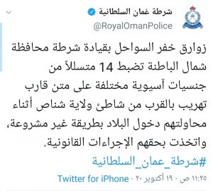 زوارق خفر السواحل بقيادة شرطة محافظة شمال الباطنة تضبط 14 متسللاً من جنسيات آسيوية مختلفة على متن قارب تهريب بالقرب من شاطئ ولاية شناص أثناء محاولتهم دخول البلاد بطريقة غير مشروعة، واتخذت بحقهم الإجراءات القانونية.