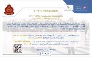 تعلن وزارة العمل بالتنسيق مع الحرس السلطاني العماني عن فتح باب التجنيد لحملة دبلوم التعليم العام أو ما يعادله (ذكور) كجنود مستجدين لعام (2022م)، ابتداء من يوم غد و حتى يوم السبت الموافق ١٥ أكتوبر 2022م.