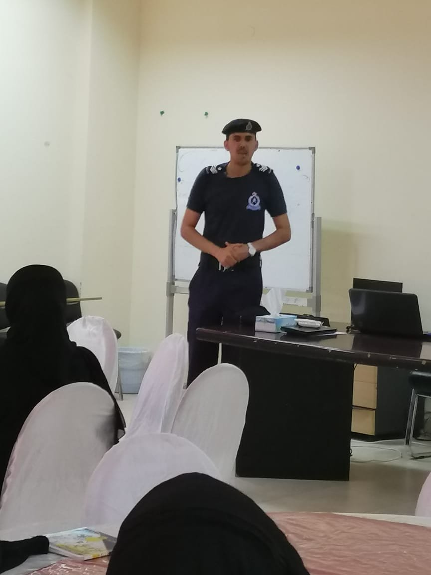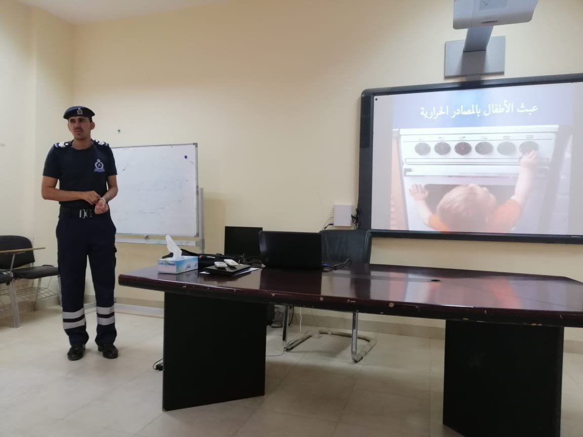 ثم تم عرض فيديو عن كيفية الإخلاء في حالة حدوث حريق… وعرض عن الأقسام التي تتوفر في مركز الدفاع المدني والخدمات التي يقدمها لخدمة المحتمع