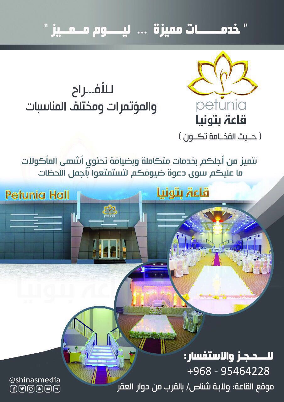 قاعة ملكية في ولاية شناص بمنطقة العقر وتقع بالقرب من دوار العقر، تمتاز القاعة بفخامتها وتكاملها حيث تزخر بخدمات راقية للحفلات والمناسبات الراقية، يوجد في القاعة مطبخ يوفر أشهى المأكولات بمختلف أنواعها، ما عليك سوى الحجز وترك الباقي على إدارة القاعة فهي ستوفر وتسخر لك كل الخدمات والامكانيات بأسعار تنافسية.