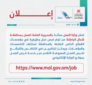 مديرية العمل في محافظة شمال الباطنة تعلن عن توفر فرص وظيفية