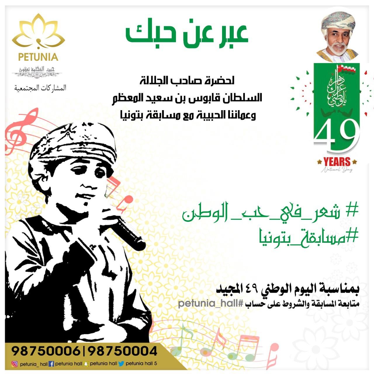 شروط المسابقه 1-ان يكون عمر المتسابق من 7 الى12سنه 2-ان لا تتعدى أبيات القصيدة 6أبيات ولا تقل عن ذلك على أن يكون اختيار الابيات من ديوان أي شاعر أو شاعره أو منهج دراسي أو أغنية وطنية 3-محاكاة طريقة الشعراء في أسلوب الالقاء 4-جمال ونبرة الصوت 5-مراعاة النطق الصحيح والسلامة اللغوية للابيات 6-أن تكون القصيدة وطنية تعبر عن حب قابوس او حب الوطن 7-الالتزام بالزي العماني الذي يعبر عن الفرحة بالعيد الوطني 49 المجيد 8-تكون المشاركة عن طريق تسجيل مقطع فيديو 9- نسبة التصويت ٤٠٪ عبر حساب صفحة بتونيا و٦٠٪ للجنة 10- طريقة التصويت @ وضع اعجاب ( لايك) مع اضافة تعليق مثلا كتابة ” ما شاء الله أو وضع 🌹 11- يمنع التصويت عبر الحسابات الوهمية ويكون سببا في خسارة المتسابق للمتسابق وإرساله على الرقم 98750006 10-يبدأ استقبال المشاركات من تاريخ 6/11 وحتى 18/11 لجنة التحكيم: 1/علي حسن المزروعي 2/علي فرج المطروشي 3/علي سيف المقبالي جوائز المسابقة جوائز مالية للمركزين الأول والثاني *ملاحظة/في حالة الفوز في المسابقه يجب إحضار ما يثبت هوية المتسابق وعمره عند استلام الجائزة