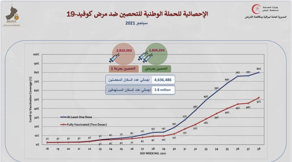 فيما بلغ إجمالي المُطعّمين بجرعتين مليونًا و826 ألفًا و224 شخصًا بنسبة بلغت 52 بالمائة وقد بلغ إجمالي الجُرعات المُعطاة 4 ملايين و636 ألفًا و486 جرعة.