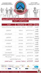 يسر الاتحاد العماني للرماية أن يعلن عن إقامة بطولة الاتحاد العماني للرماية بالأسلحة الأولمبية ( ضغط الهواء ١٠ أمتار ) للناشئين والناشئات والعموم (ذكور/إناث) والأشخاص ذوي الإعاقة ، وذلك بمجمع السلطان قابوس الرياضي ببوشر ( ١٣ – ٣١ أغسطس ٢٠٢٢م ).