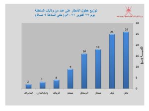 🌧️ تـوزيـع هطول الأمطار على عدد من ولايات السلطنة 27 أكتوبر 2021م ( حتى الساعة 9 مساءً).