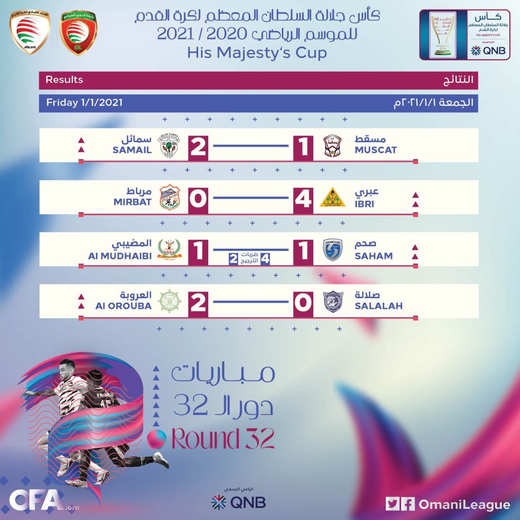 ‏🗓 نتائج مباريات يوم الجمعة من الدور 32 لمسابقة كأس جلالة السلطان المعظم للموسم الرياضي 2021/2020.