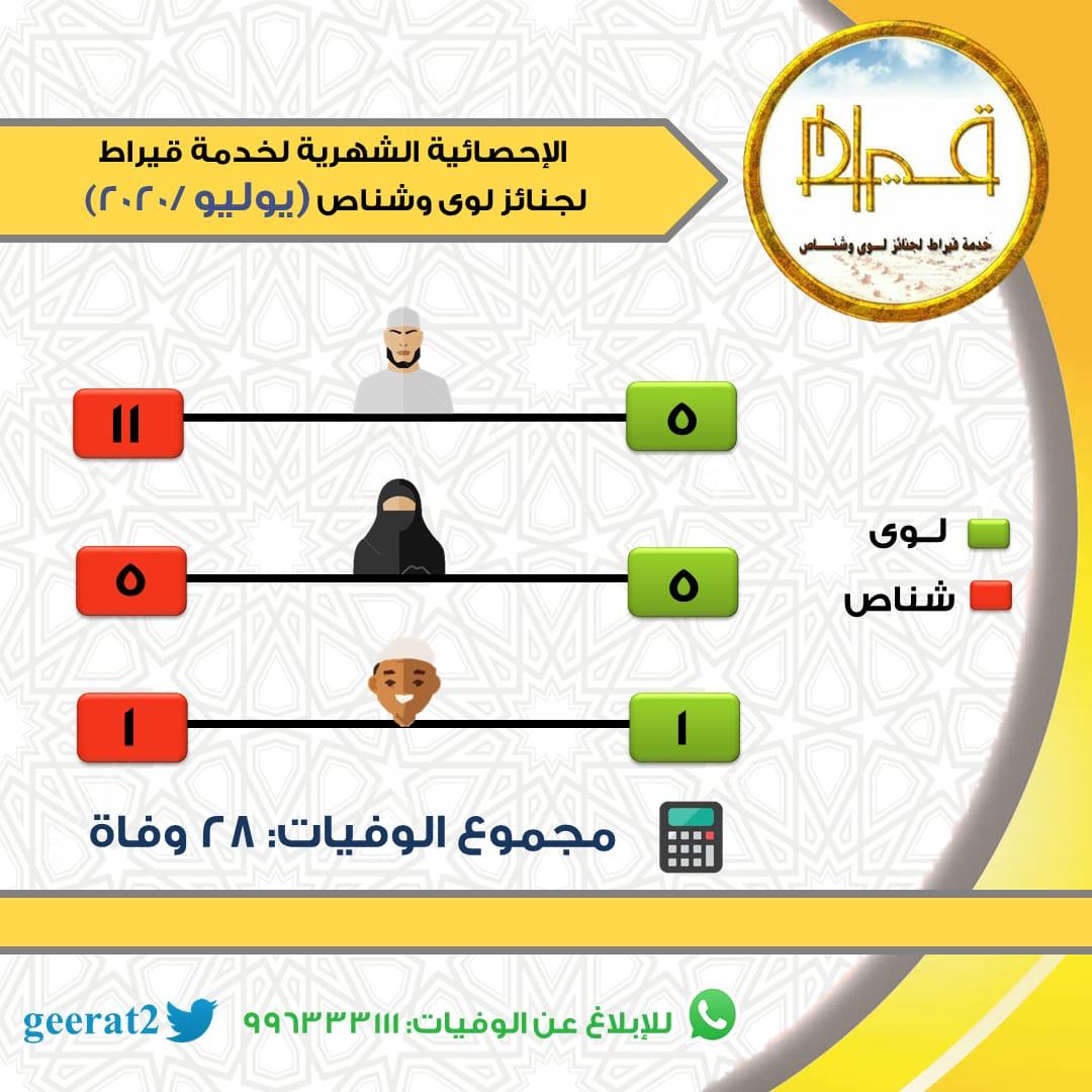 🔴 إحصائية خدمة قيراط لجنائز لوى وشناص في شهر يوليو ٢٠٢٠ اللهم اغفر للمؤمنين والمؤمنات والمسلمين والمسلمات الأحياء منهم والأموات.