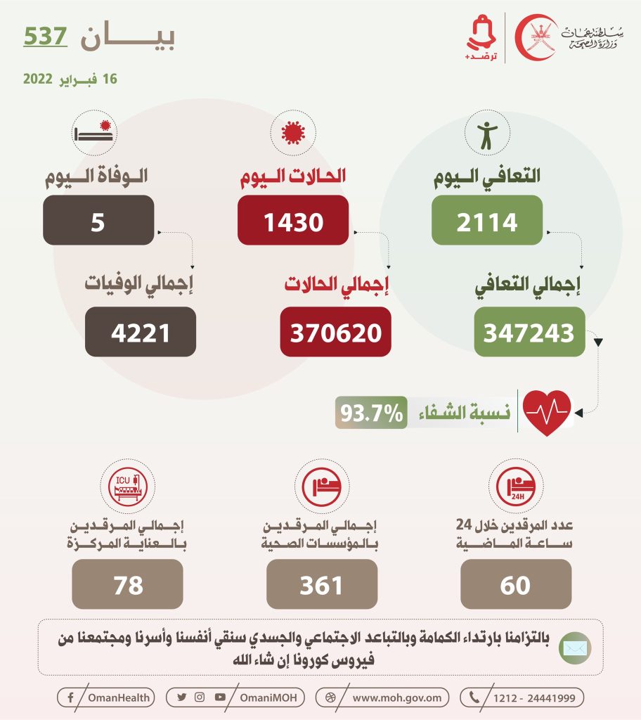 وأوضحت الوزارة أن إجمالي عدد الحالات المسجلة بفيروس كورونا “كوفيد19” في السلطنة 370620 إصابة ، و بلغ إجمالي الوفيات 4221 وفاة ، بينما بلغ إجمالي المتعافين 347243 شخص.