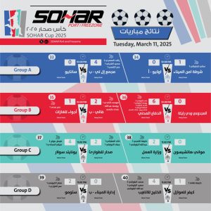 أسفرت نتائج الجولة الثالثة للمجموعات الأولى والثانية والثالثة والرابعة من بطولة كأس ميناء صحار والمنطقة الحرة 2025 عن تأهل فريق شرطة أمن الميناء وفريق اوكيو (أ) وفريق الدفاع المدني وفريق فالي (ب) وفريق وزارة العمل وفريق مؤاني هاتشيسون وفريق ستومو وفريق الخليج للأنابيب إلى دور 16 بعد مباريات مثيرة، وتستكمل الليلة مباريات الصعود بثمان مباريات في المجموعات من الخامسة إلى الثامنة.